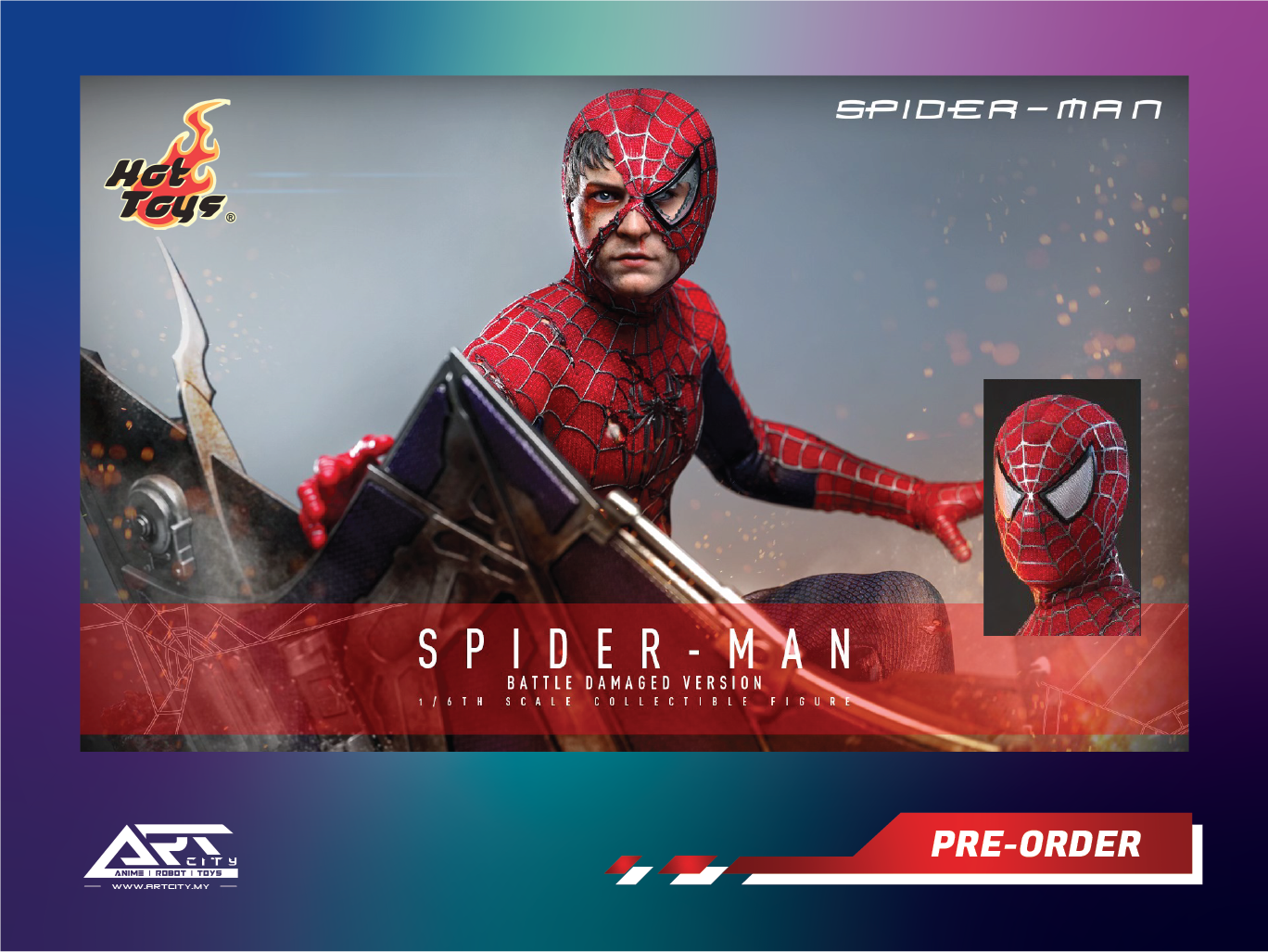 – Authentic and detailed likeness of Tobey Maguire as Spider-Man in battle-damaged state from the movie Spider-Man